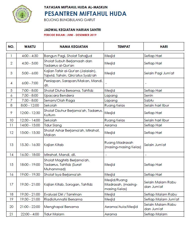 Jadwal Kegiatan Harian Santri 24 Jam Pesantren Miftahul Huda